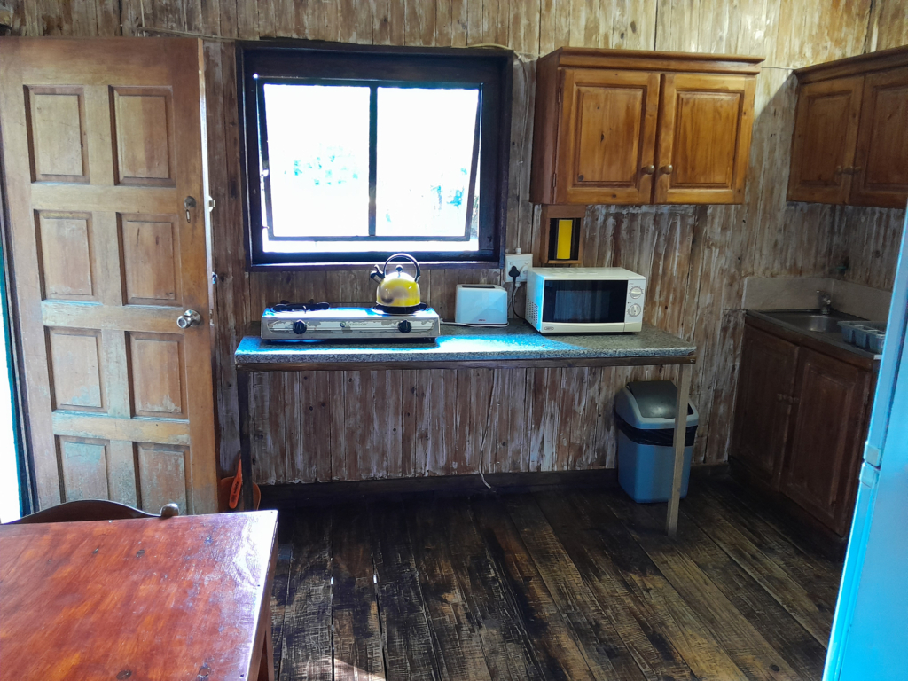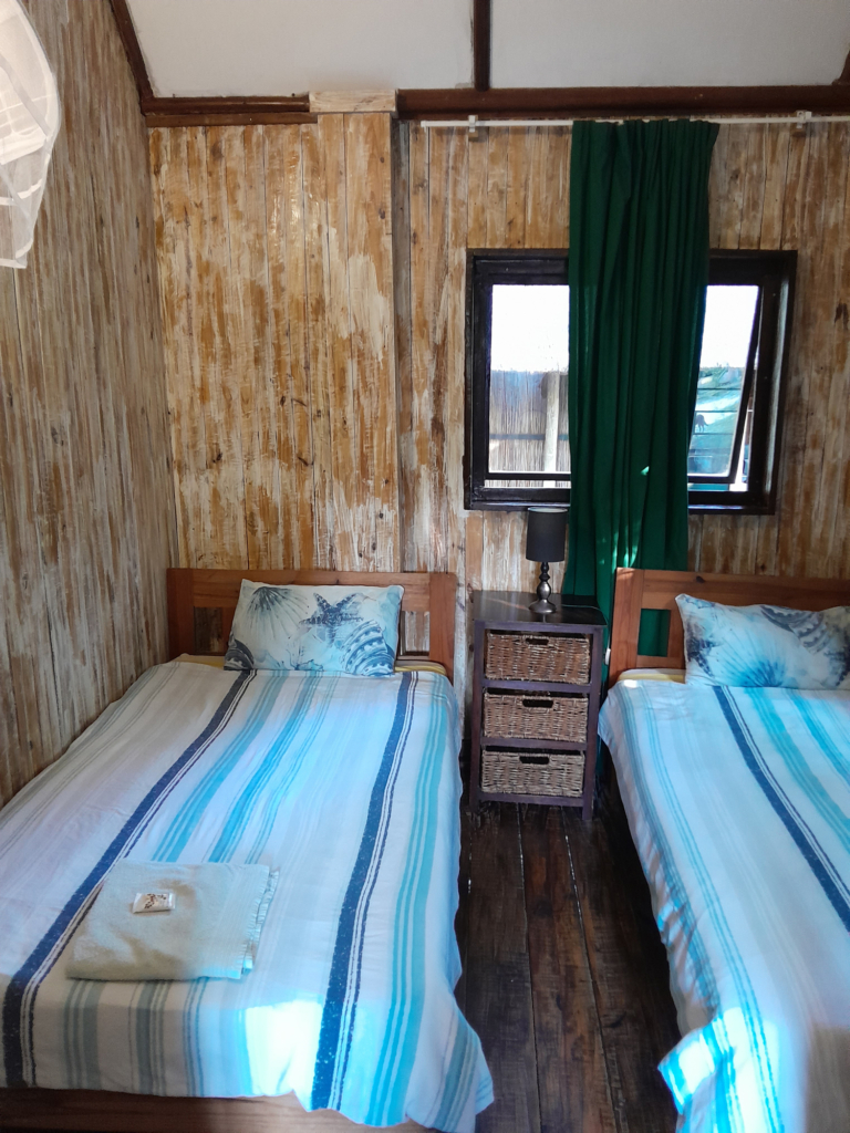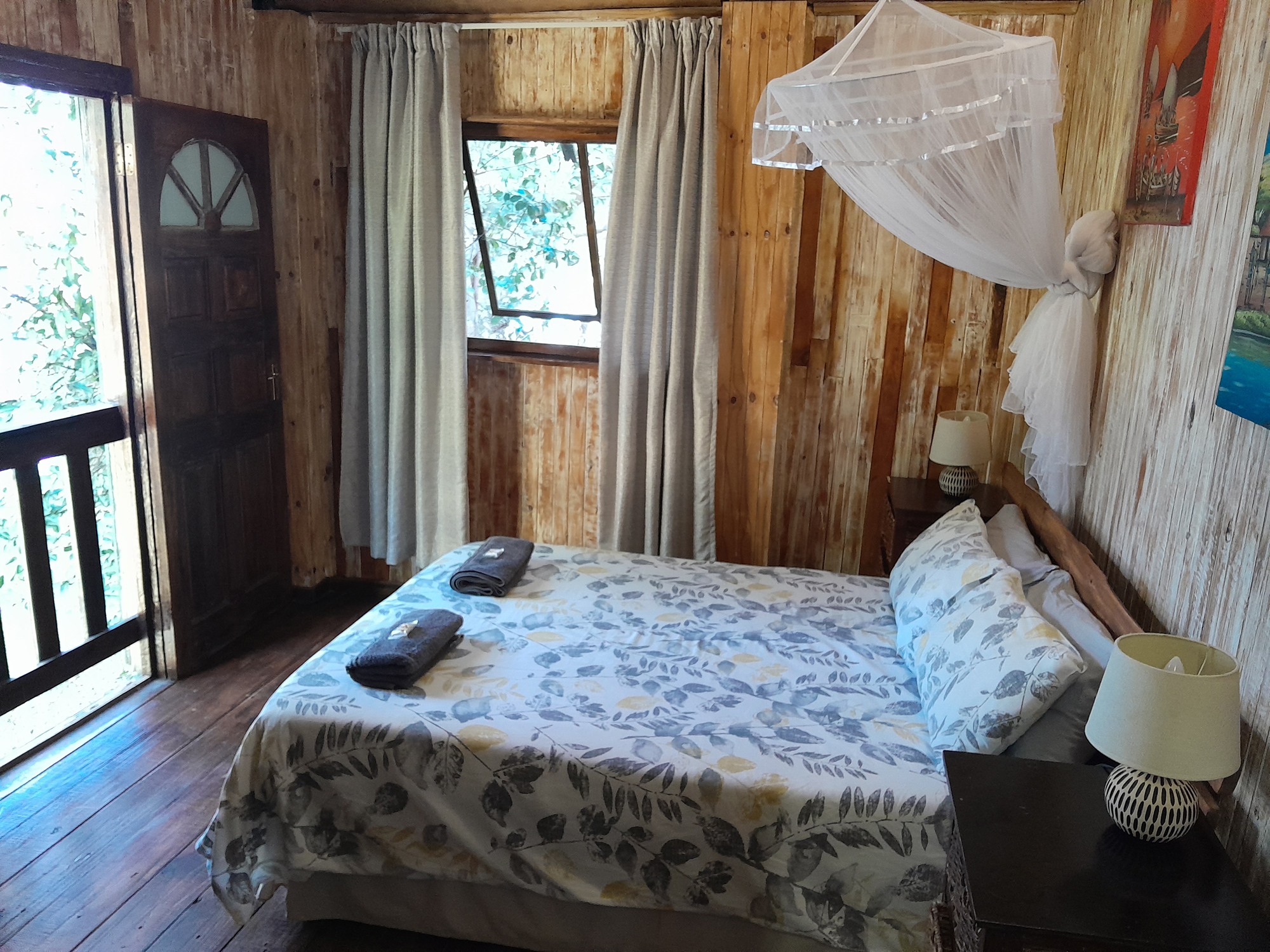 A two-room wooden family casita that sleeps four. Main room has a double bed with a beautiful view of the garden. The second room has two single beds. The kitchen has a dining room area and is fully-equipped. There is a bathroom with shower and toilet.